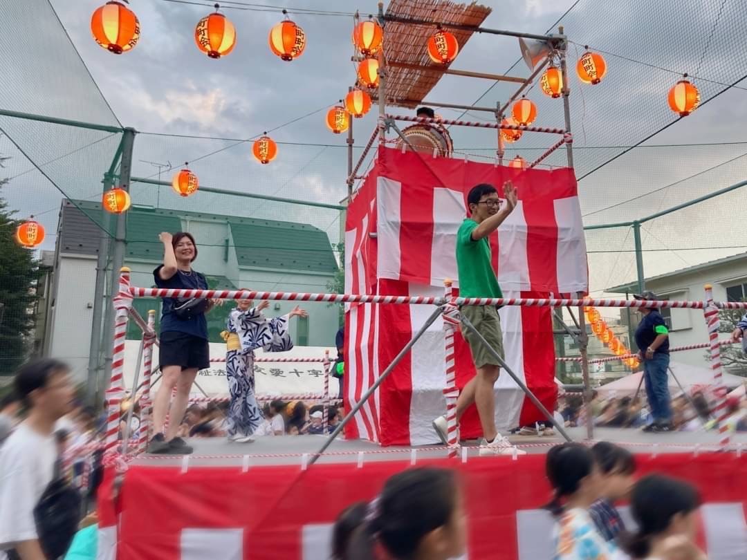 午後6時、盆踊りのスタートです。「東京音頭」では、PTA役員と先生方もやぐらの上へ。