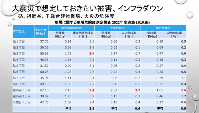 原岡さんが見せてくれたのは、砧、祖師谷、千歳台にマグニチュード7程度の地震が起きた場合の建物倒壊危険度、火災危険度です。