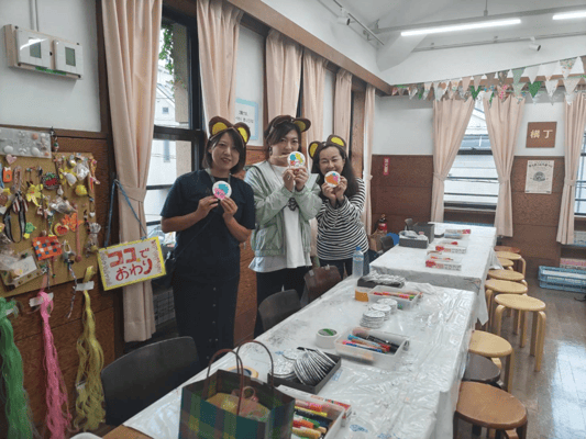 陶芸のお皿、写真フレーム、ふわふわリース、ポーチ、かごと帽子の小物、指輪や髪飾りのアクセサリー、古本屋(紙芝居)のお店。子ども実行委員たちも、前半と後半に分かれて、店番の時間以外はお店巡りを楽しみます。