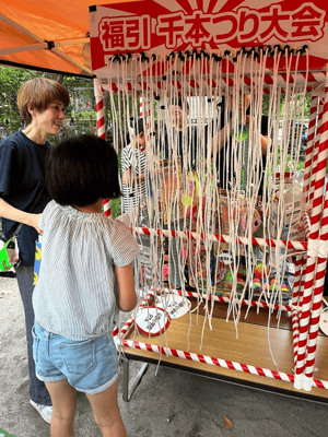 暑い中行列に並び、たくさん連なるひもを見定めて、えいや!と引いていく子どもたち。
