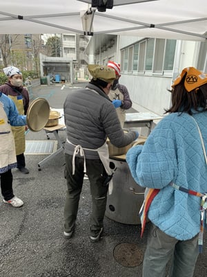 温かく重い豚汁の入ったお鍋が大人たちの手で教室に運び込まれると、「早く食べたーい」