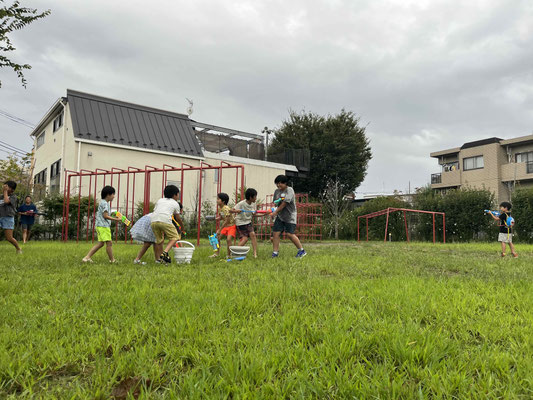 一方、順番待ちの時間には、校庭横の芝生スペースで子どもたちが水鉄砲で遊ぶ姿も。