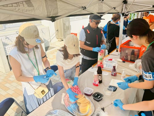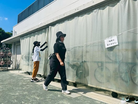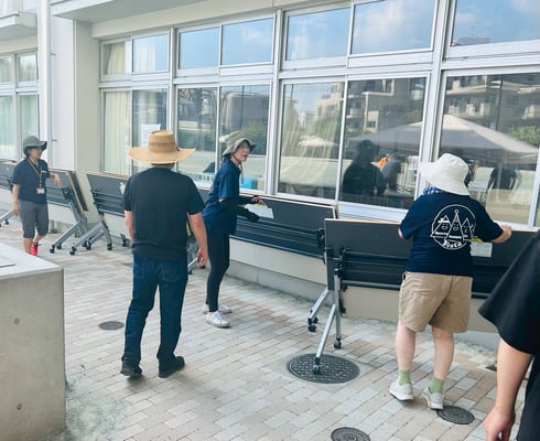この日は35度以上の猛暑日で、炎天下での作業となり、冷房の効いた休憩室を設けるなど、