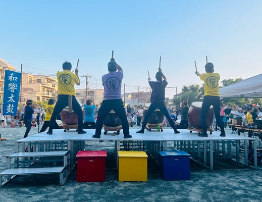 バンドグループの『キヌタスイッチ』と、お祭りの実行委員会の長島委員長が率いる『和響太鼓』の和太鼓の演奏は、観客を大いに盛り上げました。