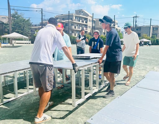 PTA本部の皆さんは、地域の方々と協力しながら、運動場でテントを張ったり、ステージの設営、椅子やテーブルを運び出すなど、手際良く進められました。