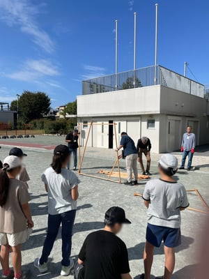 この日は少し暑さがありましたが、風もなく、たっぷり一時間ほど作業して全てのグループが無事家を完成させることができました!