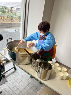 炊き出しコーナーでは「炭水化物だけだと体調を崩しやすい」という過去の避難所での話もあり、今年は食物繊維がしっかり摂れる乾燥野菜を使ったお味噌汁を提供しました。あたたかくて栄養もあり「おいしい〜!」と大好評でした!