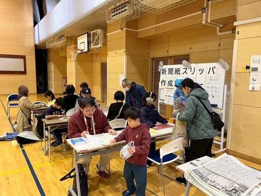 当日のPTAブースでは、新聞紙スリッパ作り体験を実施。実際に参加者のみなさんに新聞紙を折ってもらいながら作っていきました。「こんなに簡単なのに、しっかりしてる!」「家でもやってみます!」と驚きと感激の声がたくさん聞けて嬉しかったです♪