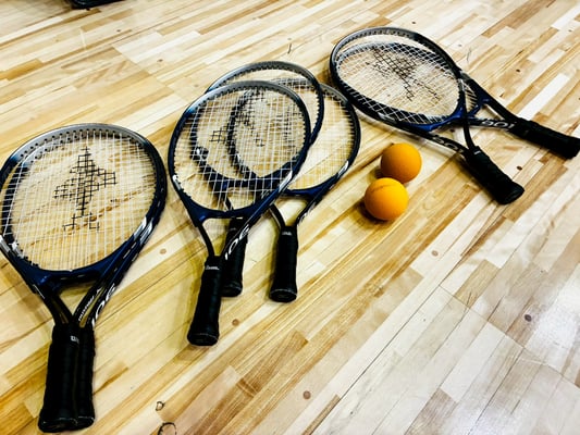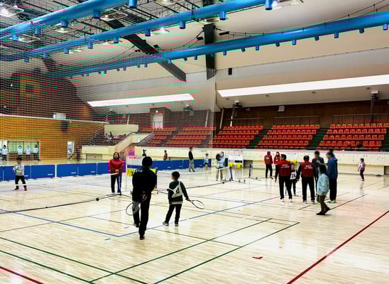 身体が温まったところで、ショートテニスとキンボールに分かれての体験です。
