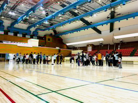 キンボールは、直径122cmの大きなボールを床に落とさないよう打ち合う競技です。
